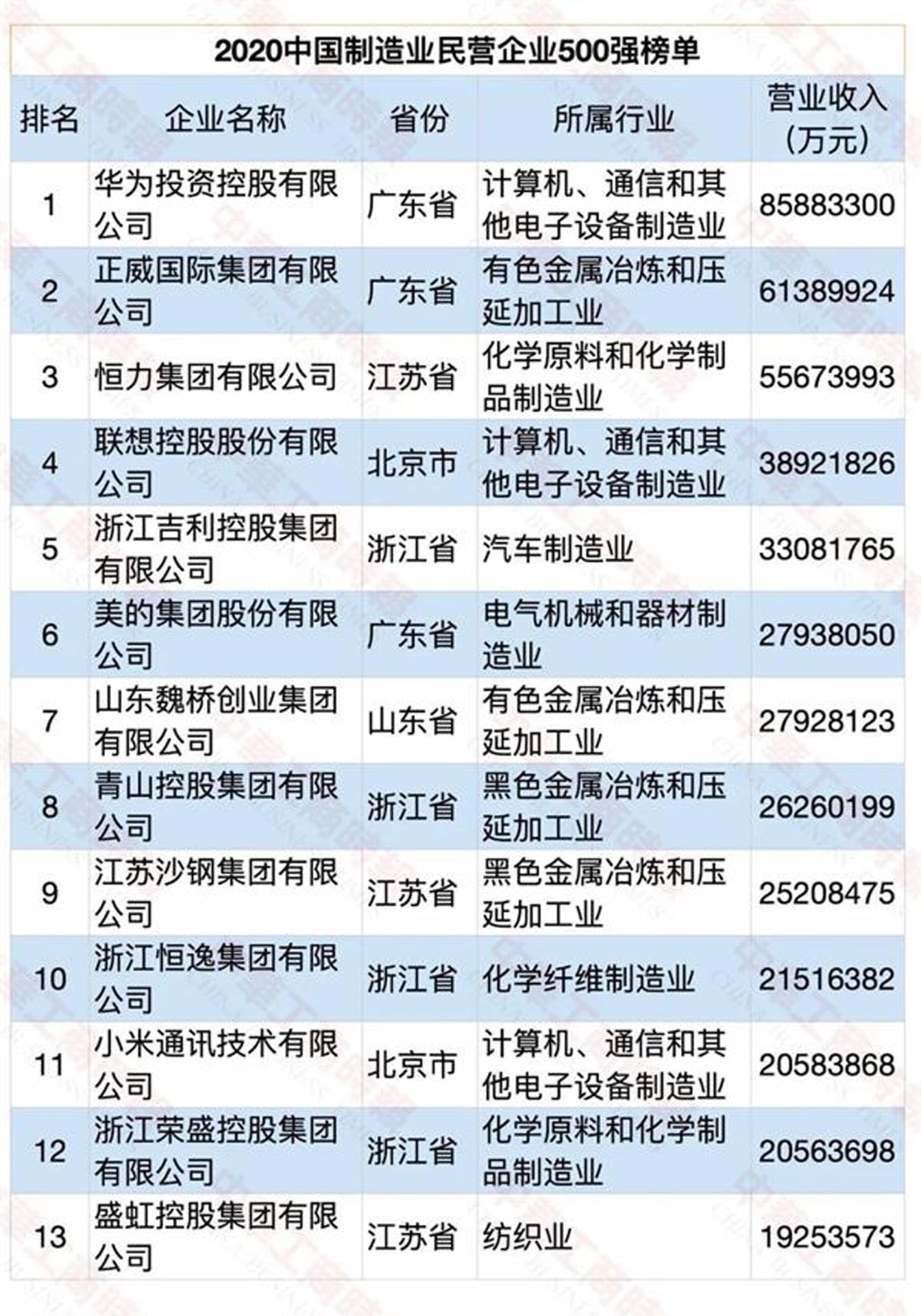從2020中國民營企業制造業500強榜單顯示:華為投資控股有限公司、正威國際集團有限公司、恒力集團有限公司位列“2020中國制造業民營企業500強”前三名; 安徽天康(集團)股份有限公司以106.3億元營收入排名第443名。