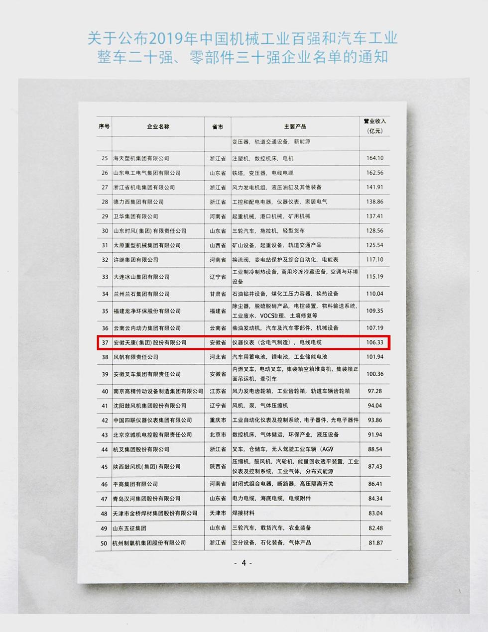 9月16日,第十六屆“中國機械工業(yè)百強、汽車工業(yè)整車二十強、零部件三十強企業(yè)信息發(fā)布會”在重慶銅梁召開。會上分別公布了2019年中國機械工業(yè)百強、汽車工業(yè)整車二十強、零部件三十強企業(yè)名單。安徽天康集團再次入圍中國機械工業(yè)百強,位列第37位。