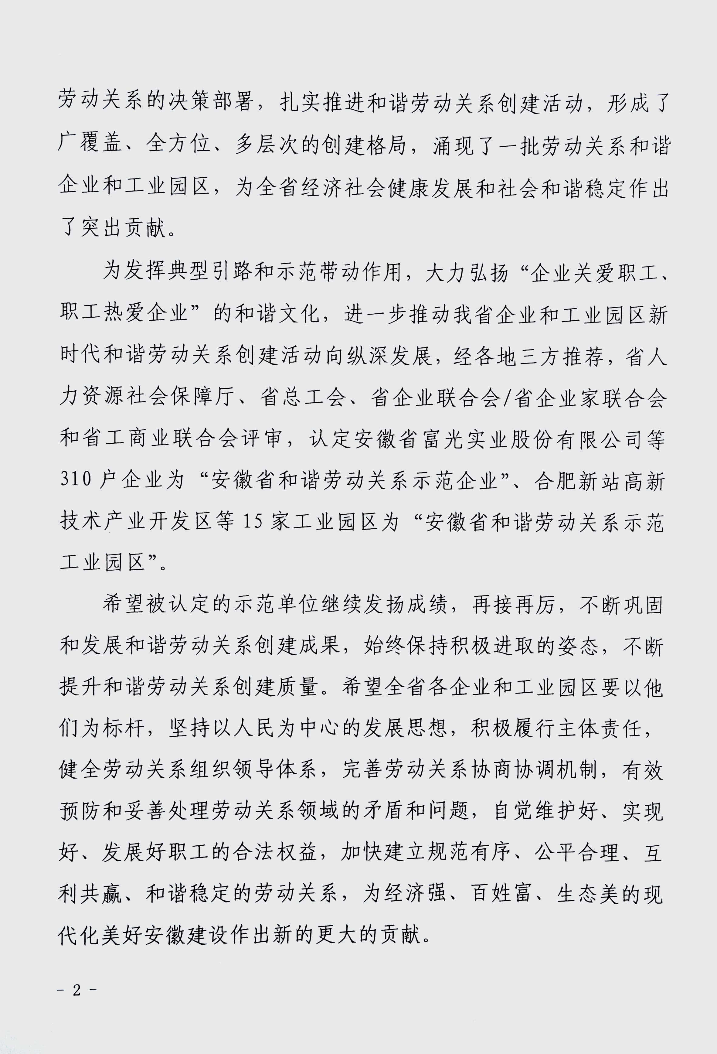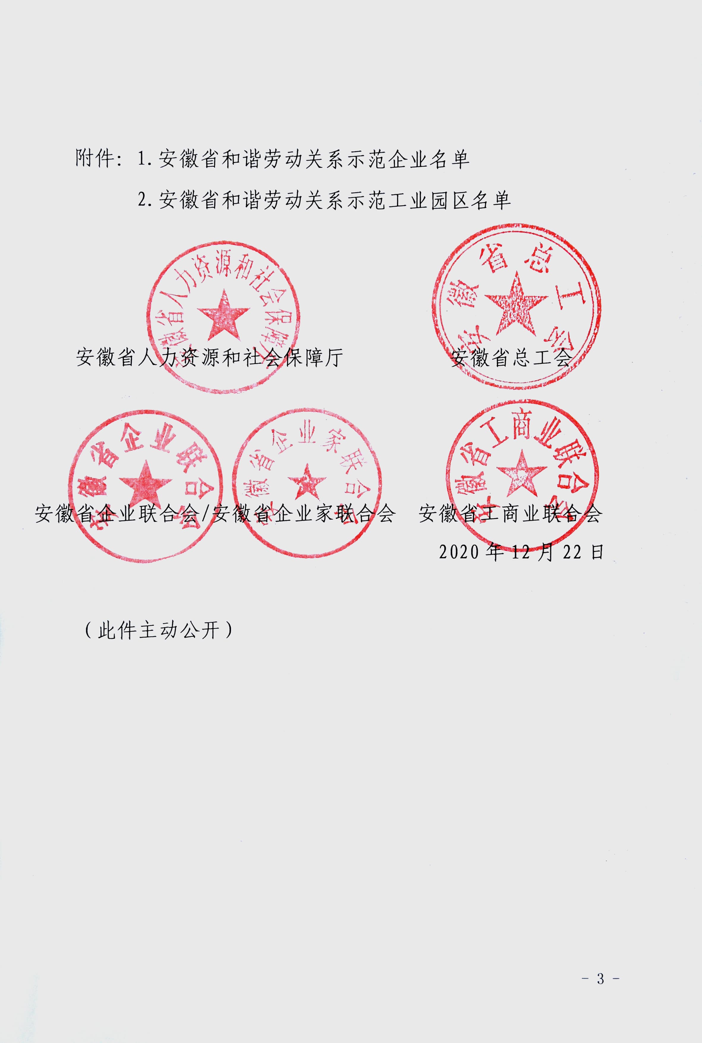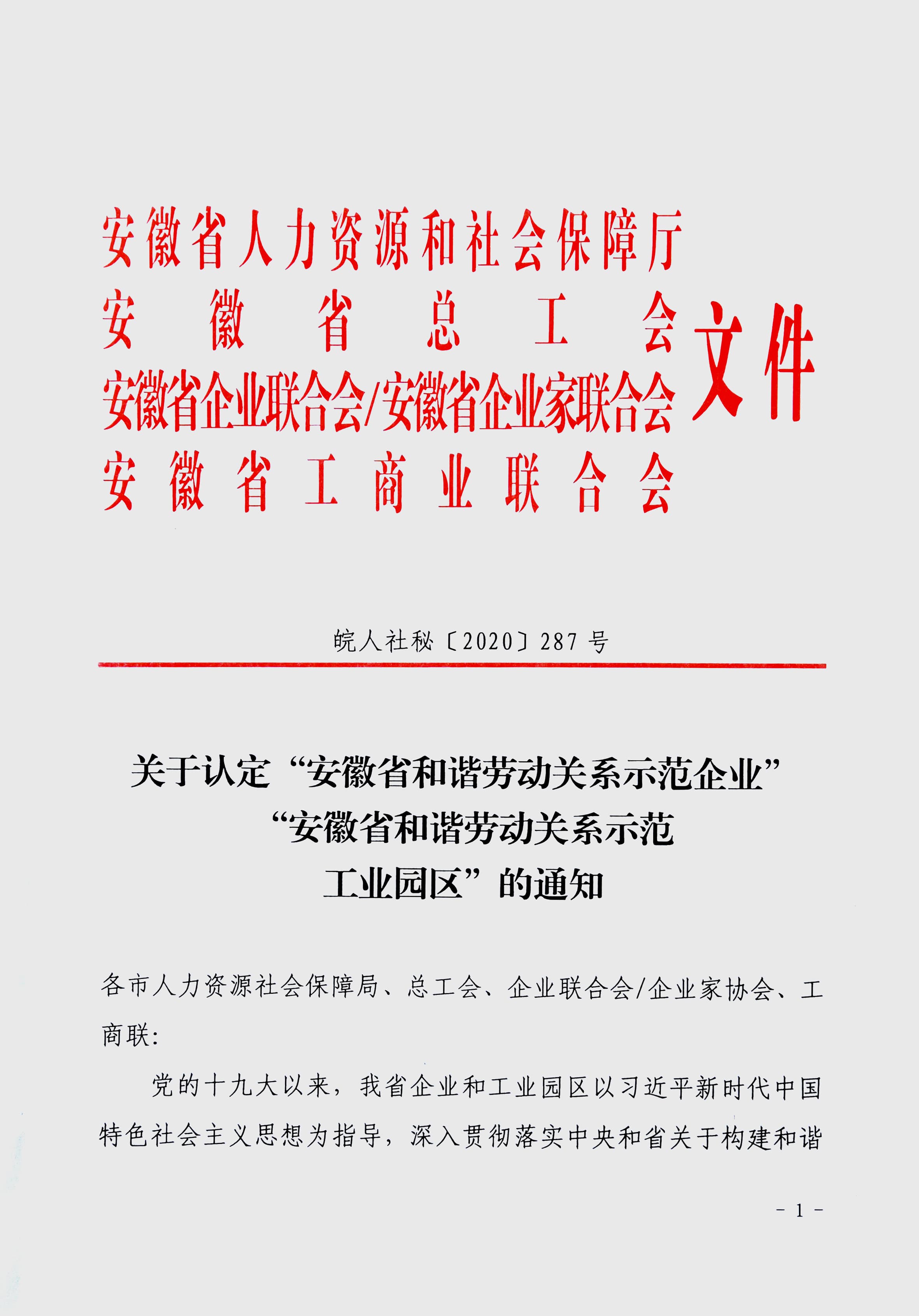 12月25日,安徽省構建和諧勞動關系工作推進會在合肥召開,會上總結了“十三五”全省勞動關系工作成就,研究分析面臨的形勢,部署安排“十四五”工作任務,公布了“安徽省和諧勞動關系示范企業”和“安徽省和諧勞動關系示范園區”名單。安徽天康集團被認定為“安徽省和諧勞動關系示范企業”。