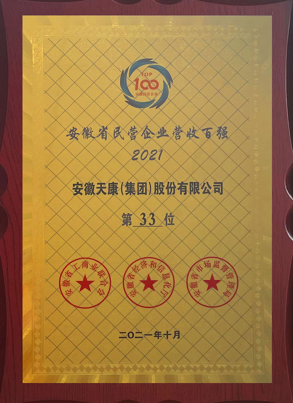 10月21日,2021安徽省民營企業百強發布會在阜陽隆重舉行。會上發布了2021安徽省民營企業營收百強、制造業綜合百強和服務業百強榜單,安徽天康集團榮獲2021安徽省民營企業營收百強、制造業綜合百強,連續16年上榜。
