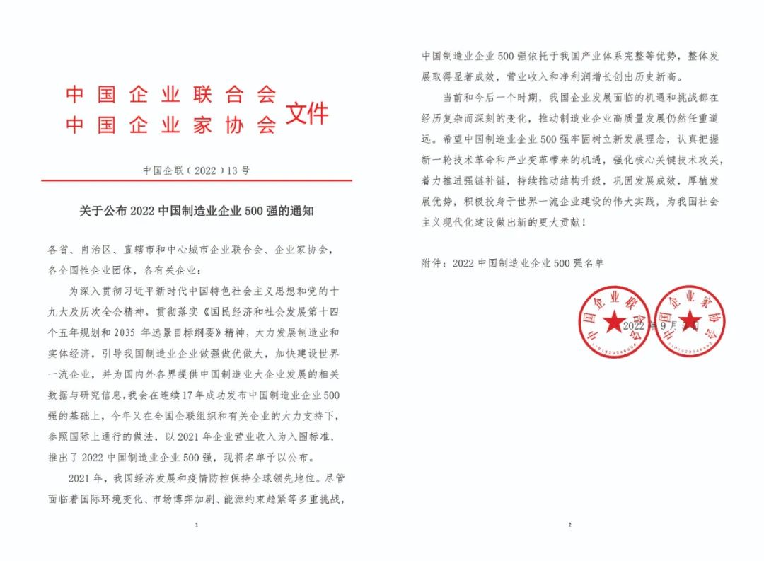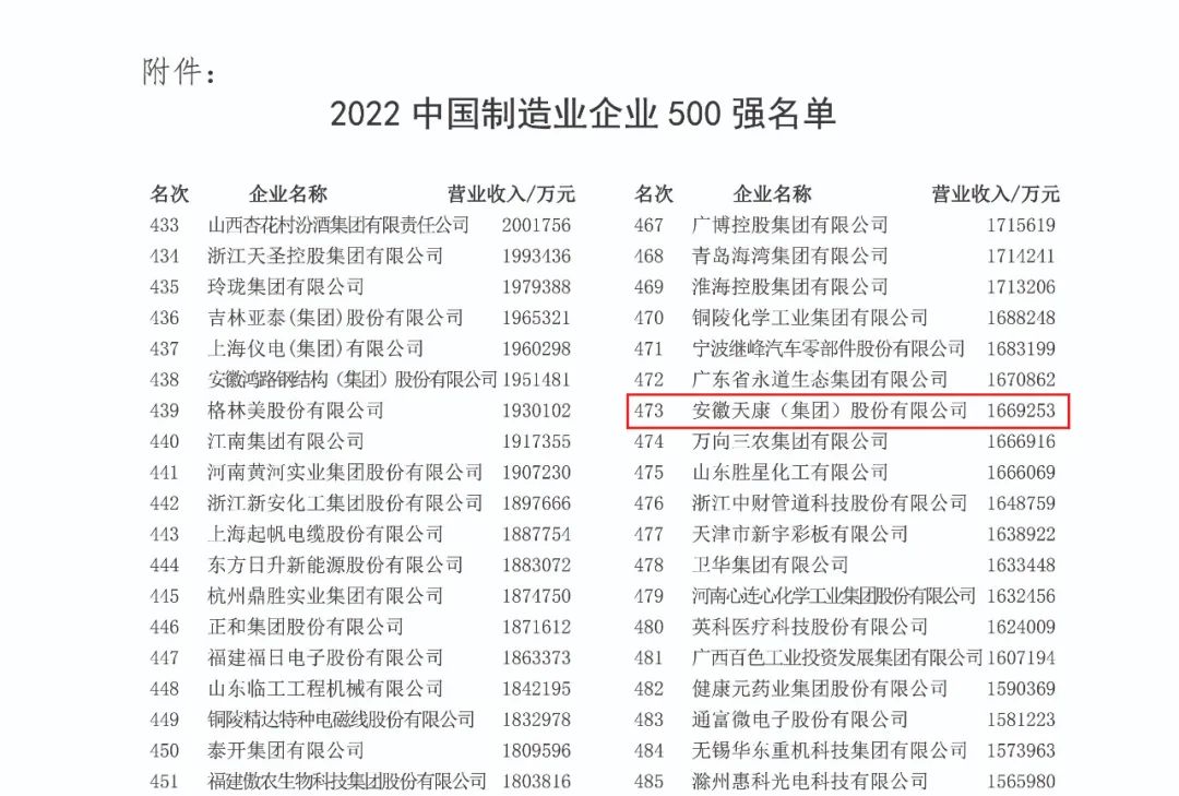 2022中國制造業企業500強榜單發布 安徽天康集團再次入榜