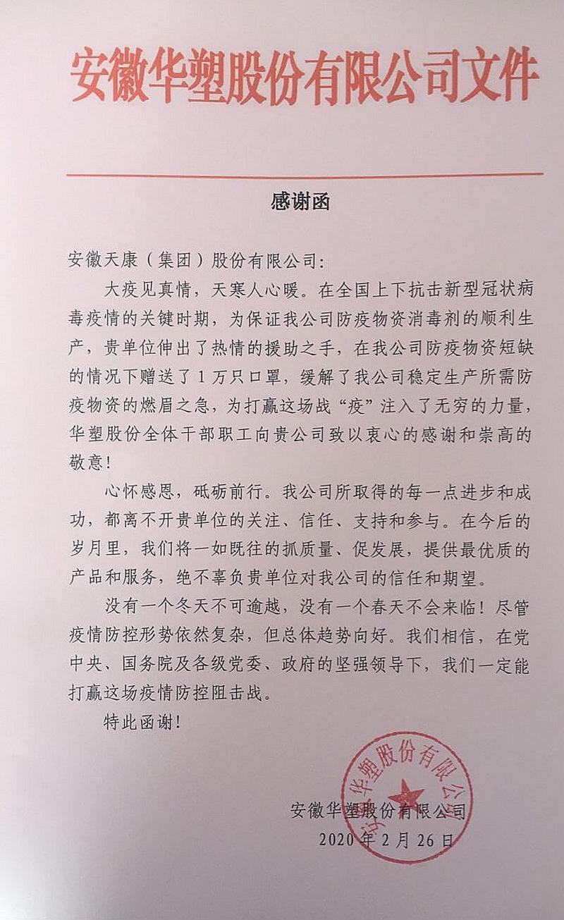 “安徽天康集團的仁義善舉,體現了豈曰無衣、與子同袍的大愛境界,彰顯了一方有難、八方支援的兄弟情懷……”近日,黑龍江應急管理廳、中國能源建設集團廣東電力設計研究院有限公司、中國能源建設集團廣東火電工程有限公司、安徽華塑股份有限公司等單位紛紛發來感謝信,向安徽天康集團在疫情期間的無私援助表達真誠的謝意和敬意。