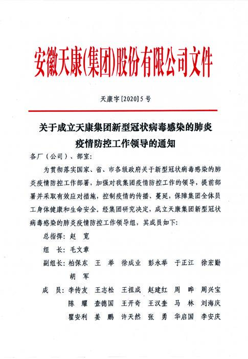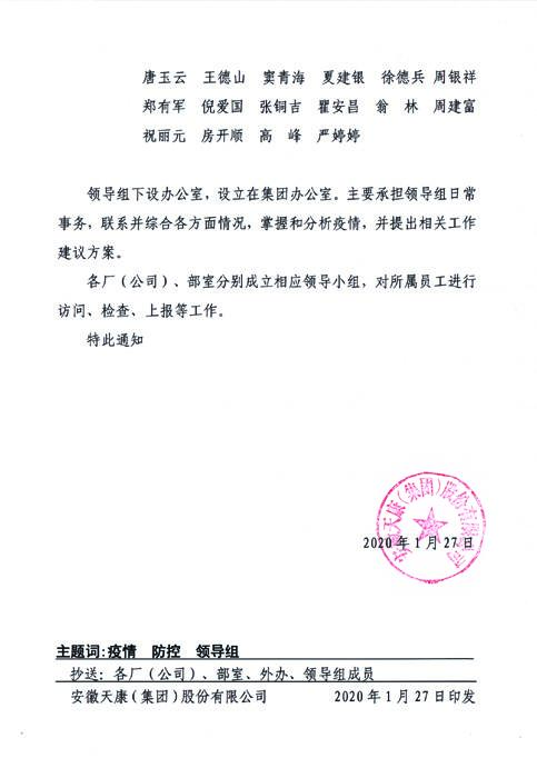 2020年1月27日,安徽天康集團(tuán)領(lǐng)導(dǎo)班子召開(kāi)了冠狀病毒防疫討論會(huì),成立新型冠狀病毒感染肺炎疫情防控工作領(lǐng)導(dǎo)組,集團(tuán)董事長(zhǎng)趙寬擔(dān)任總指揮,總經(jīng)理毛文章?lián)谓M長(zhǎng),集團(tuán)其他領(lǐng)導(dǎo)擔(dān)任副組長(zhǎng),各部門(mén)負(fù)責(zé)人及相關(guān)人員為領(lǐng)導(dǎo)組成員。領(lǐng)導(dǎo)組下設(shè)辦公室主要承擔(dān)防控日常事務(wù),聯(lián)系并綜合各方面情況,掌握和分析疫情,并提出做好相關(guān)工作方案。