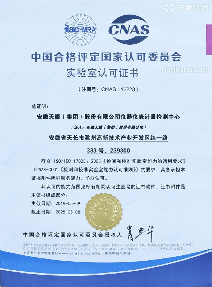近日,經過緊張而復雜的審核程序,安徽天康(集團)股份有限公司儀器儀表計量檢測中心順利通過中國合格評定國家認可委員會的文審和現場審核,并獲得認證證書(證書編號:L12223)。