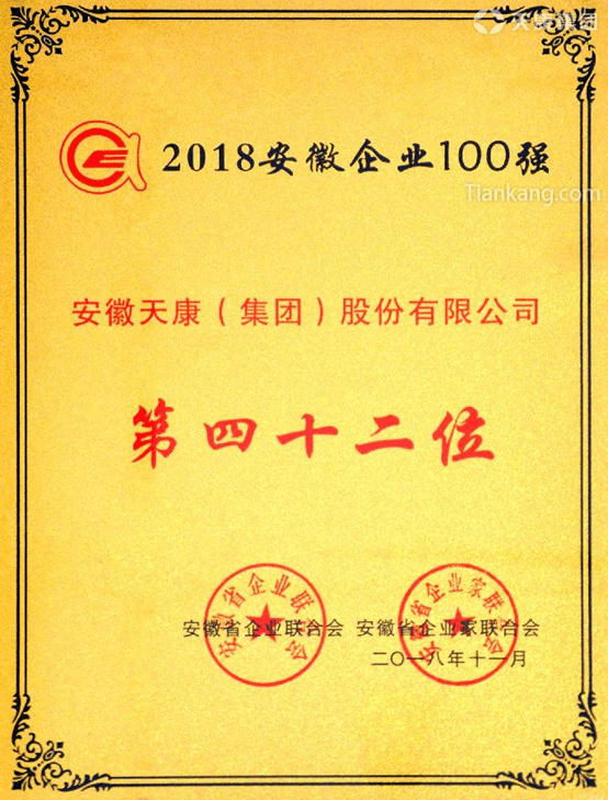 2018安徽百強企業評比以2017年營業收入為標準、國有企業和民營企業混合評比。作為安徽省民營企業的杰出代表,安徽天康集團榮列百強第四十二位。