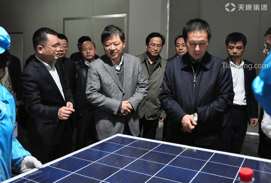 天康集團總經理毛文章向錢局長一行介紹天康光伏產品的生產與經營情況。