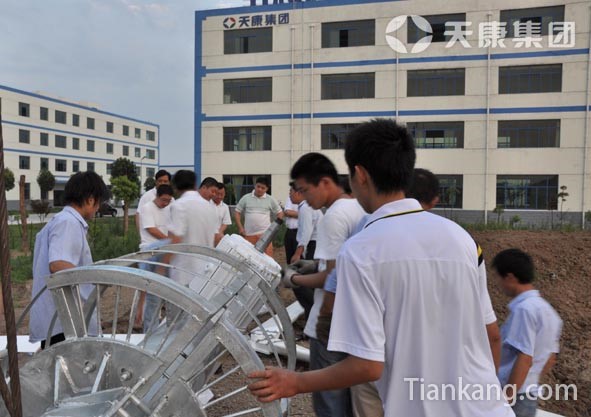 7月1日下午,天康集團新能源有限公司正在緊張地從事安徽省首臺10KW風力發電機組的地面安裝,此次風力發電機組的安裝更是由于采用了該公司自行設計研發,具有完全知識產權的風機專用塔桿液壓舉升垂直安裝的先進技術而令人關注。該項技術要求風力發電機組的全部組成部分:機艙、發電機、偏航機構、掃風直徑達8米的風輪葉片和高度超過20米的鐵塔可以在地面一次全部安裝成功后,用液壓舉升機構將角度處于水平狀態的總高度達25米的風力發電機垂直豎立成功。 該項技術的投入使用將解決海島,山區及大型自行起吊設備無法進入的邊遠地區安裝風力發電機,通訊,電力及交通裝置的問題,必將起到舉足輕重的作用。